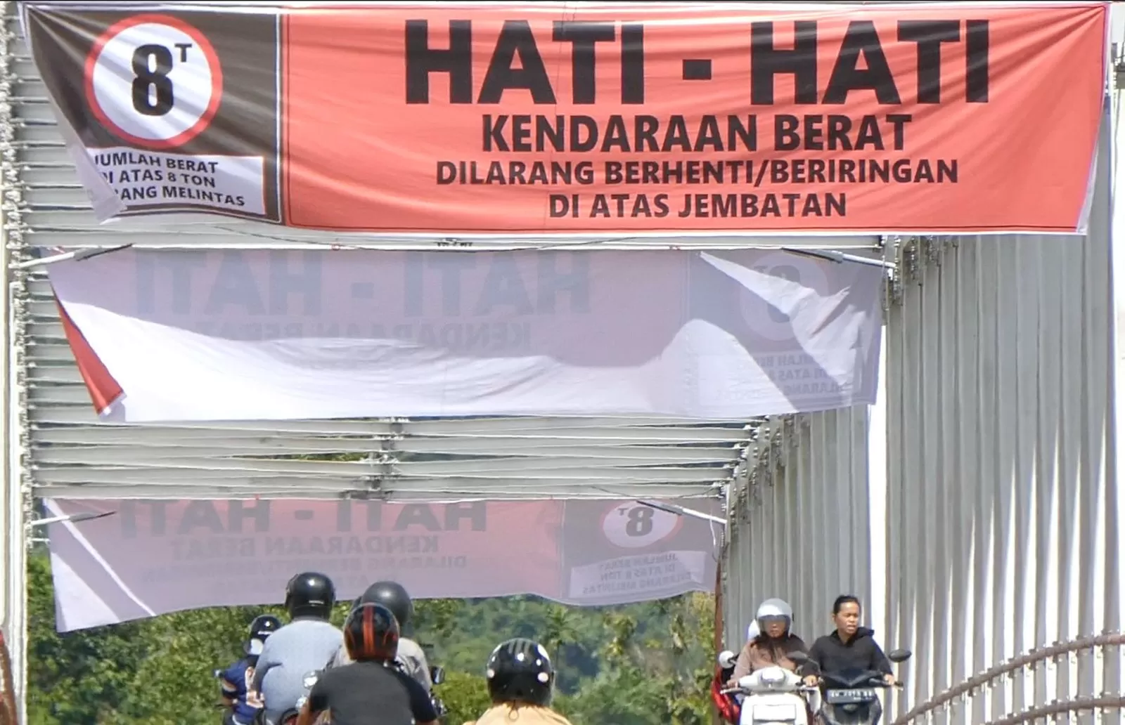 Berdasarkan pantauan di lapangan, rambu bertuliskan “Hati-Hati, Kendaraan Berat Dilarang Berhenti/Beriringan di Atas Jembatan” telah dipasang di kedua sisi jembatan. Spanduk peringatan juga terlihat terpasang pada rangka utama bagian atas, disertai penegasan batas beban maksimal 8 ton sebagai langkah antisipasi demi keselamatan pengguna jalan.